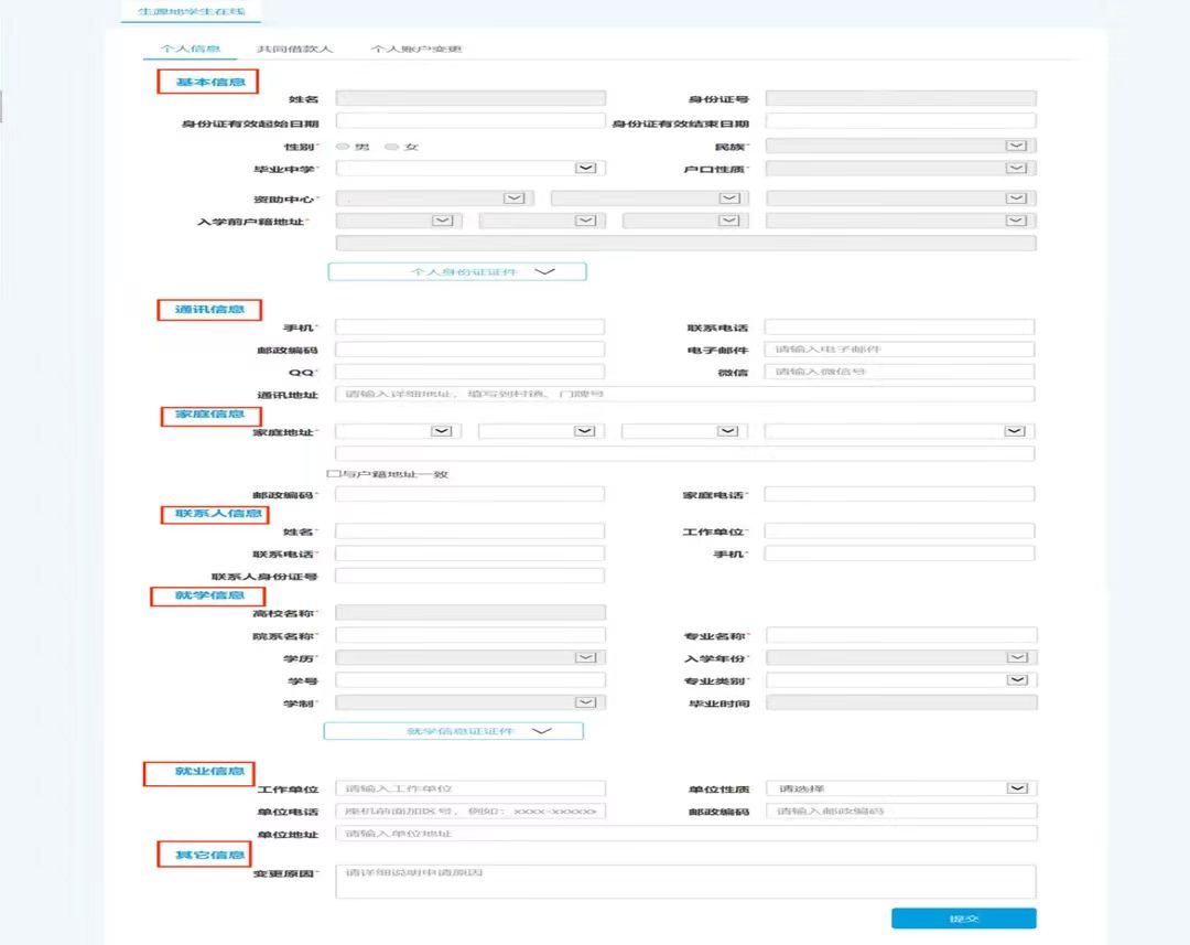 5.就学信息栏:确保就学信息栏中的内容准确无误。如就学信息有变更的,员工需持变更说明材料(包括录取通知书、高校出具的学籍异动说明、入伍通知书等)前往所属县(市、区)资助中心办理就学信息变更手续,或者由员工的共同借款人持材料前往办理。