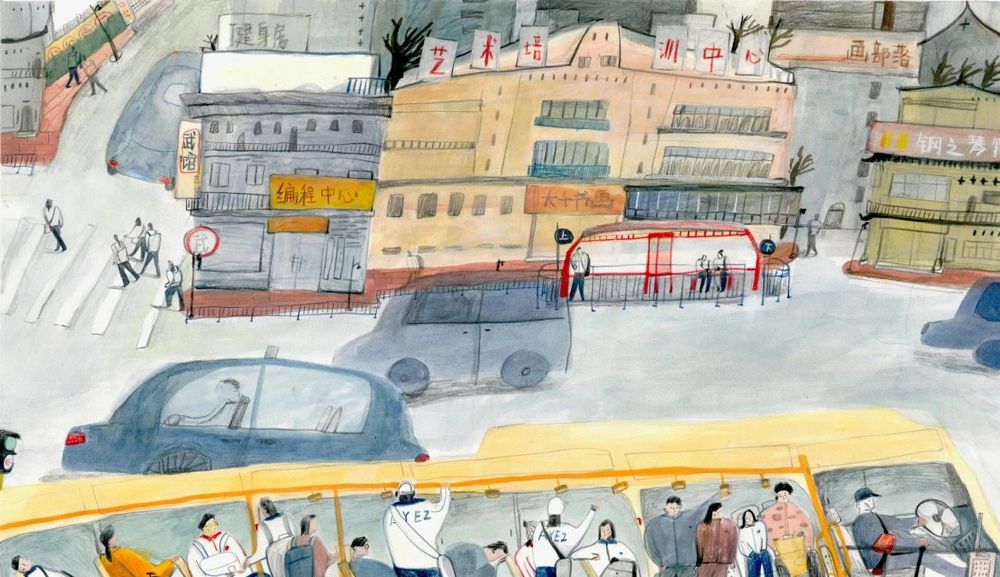 我们走到10路汽车站旁。几盏昏暗的路灯下,人们就像在水底一样。