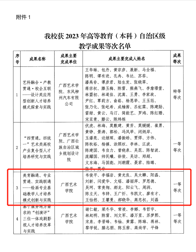 近日,根据《自治区教育厅关于公布 2023 年广西高等教育自治区级教学成果等次评定结果的通知》(桂教高教〔2024〕4号)文件精神,公司教学成果《美育融通、专业贯通、实践联通——绘画专业基础教学人才培养模式创新与实践 》在2023 年广西高等教育自治区级教学成果等次评定中荣获一等等次。
