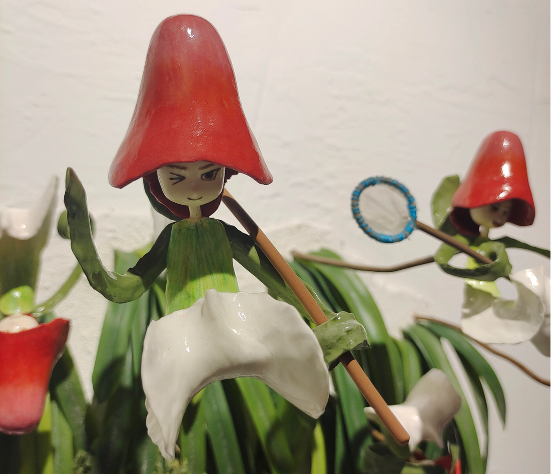 在对木论乡考察居住期间,发现当地大多数父母都外出打工,把孩子交给家里老人看管,因没有受到合适的引导和关爱,很多孩子五六年级就开始有叛逆倾,也有小小年纪就辍学终日游荡......一种爱莫能助的惆怅在我心头久久萦绕。跟随教科人员深入当地自然保护区考察中,又了解到当地有一种特色一级保护植物——小叶兜兰,它生于石灰岩山丘荫蔽多石之地或岩隙中,花型长的很奇特,花朵像倒立的精灵一样。小叶兜兰和山间的孩子们,我看来是如此的契合:植物珍贵美艳、以一种顽强的姿态垂挂于危险沟壑之间;孩子天真烂漫、以一种戏虐的神态凝望着颠倒的世界。所以我创作了这件作品,在创作中我尽力还原小叶兜兰这种极美的姿态,在此基础上塑造出不同象征孩子的神态表情,呼吁大家保护自然动植物、关注留守儿童。