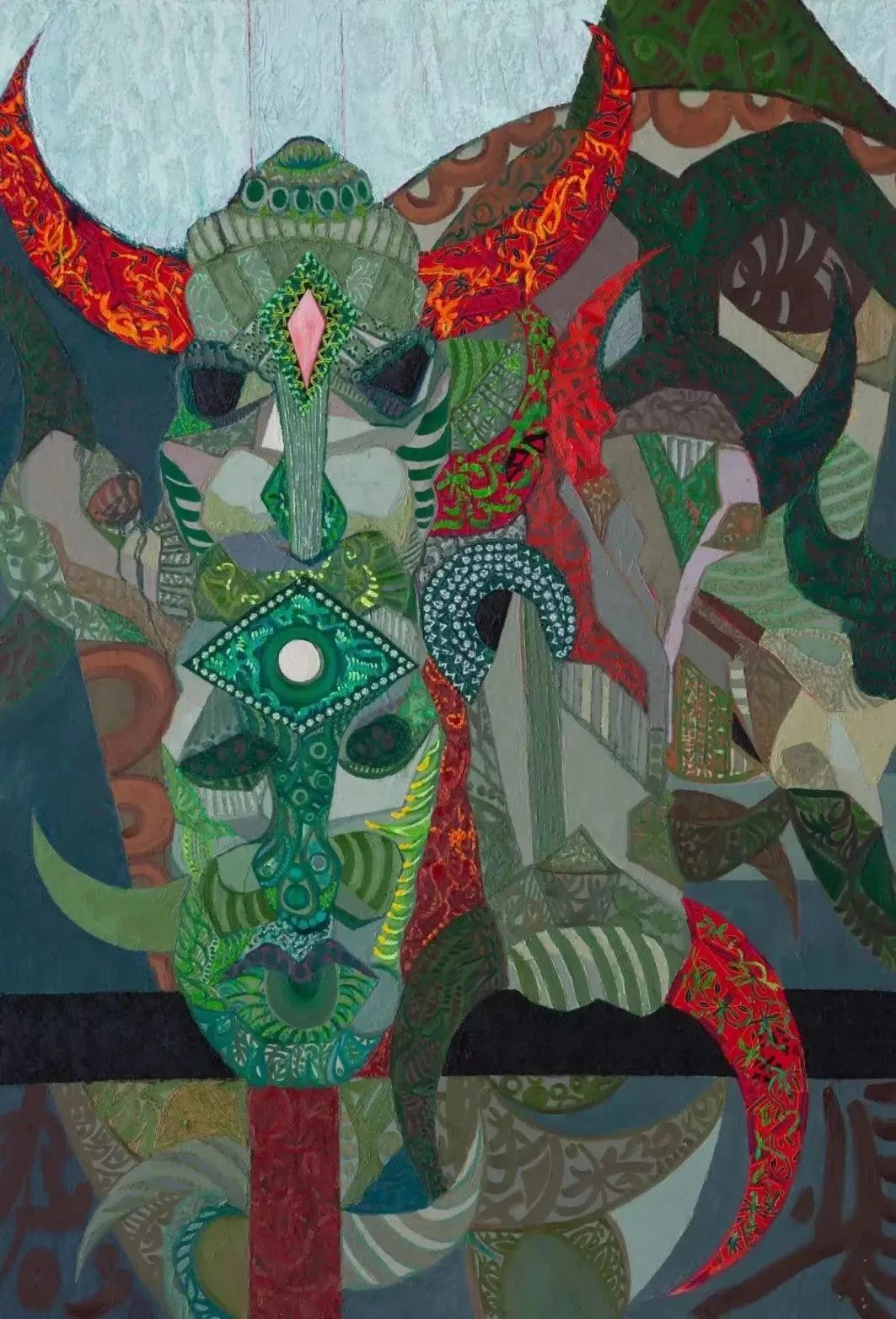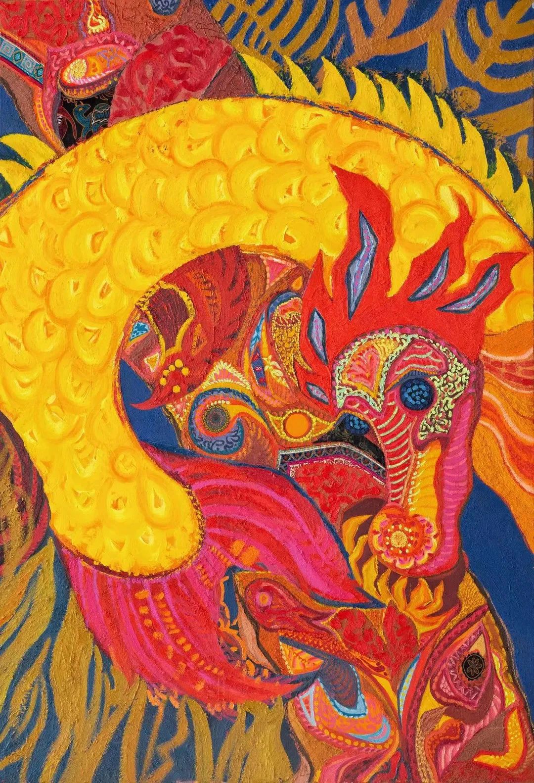 在本科的最后一次下乡写生中偶然在贺州秀水状元村了解到秀水瑶族刺绣文化,对重叠、复制的刺绣纹样和图案产生了浓厚的兴趣。在壮锦的刺绣文化中,它强烈的色彩冲击、重复出现的符号元素以及独特的变形图腾,激起了我的创作欲望。因此,在毕业创作中,我决定将西南少数民族之壮族图腾文化与油画结合进行尝试与创作,将民间传统文化带给我的震撼视觉感受和强烈内心冲击呈现在画布上