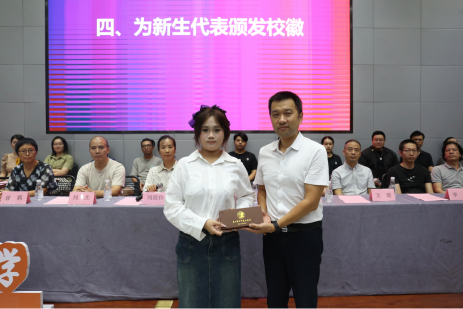 苏敬杰书记为新生代表林安琪同学授发校徽,欢迎新同学成为太阳成集团tyc234cc古天乐大家庭的一员,希望同学们珍惜“广艺太阳成集团tyc234cc古天乐人”身份,传承广艺“亲爱精诚”的校训精神,爱校荣校,勇做“时代新人”。