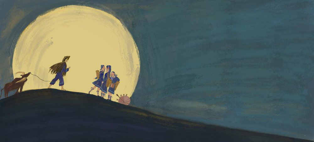 露从今夜白,月是故乡明。仲秋之节,是一个寄予了团圆相思之情的日子。在这个有着悠久历史传统的日子,月亮穿越千年永远亘古不变,永远陪伴在我们每一个人身边。画中几乎占据一半空间的那轮明月,渐渐从山坡后升起,依旧着每一天的照耀,为晚归的行人照亮归家的路,为深夜依旧忙碌生机的她的子民送去陪伴,为在外的游子送去对家乡的思念。作者的整幅画面尤为的干净,就如同那轮干净无瑕的明月,画面中心一反常态地侧重在左侧,牵牛的苗家少年,背筐拿伞的少女在前面嬉闹,一同从山坡上走来。我们不知道他们从何处归来,也不知他们往何方归去,但是无论山河海洋,总有头顶的那轮明月为他们照亮前方的路。