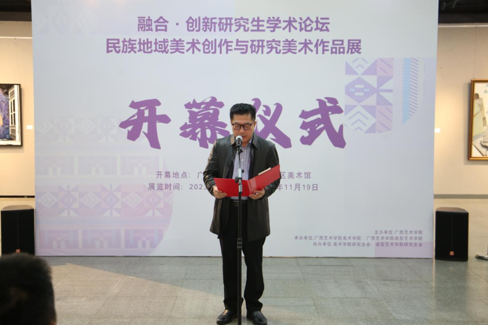 沈源同学作为参展研究生代表进行发言,他提到,作为中国现当代美术的一个重要面向,少数民族题材的美术作品承载社会变迁,蕴含时代气质,体现审美历程,关照人文精神,展现文化创新,是社会政治生态、民族审美精神与美术家自觉艺术表达三者综合的结果。广西居住着壮、汉、瑶、苗、侗、仡佬、仫佬、毛南、回、京、彝、水等十二个世居民族。青年美术工作者在选择题材进行创作时可以充分利用民族地区的地域性优势,开展少数民族文化相关的美术创作活动。以画入魂,传承优秀民族文化。